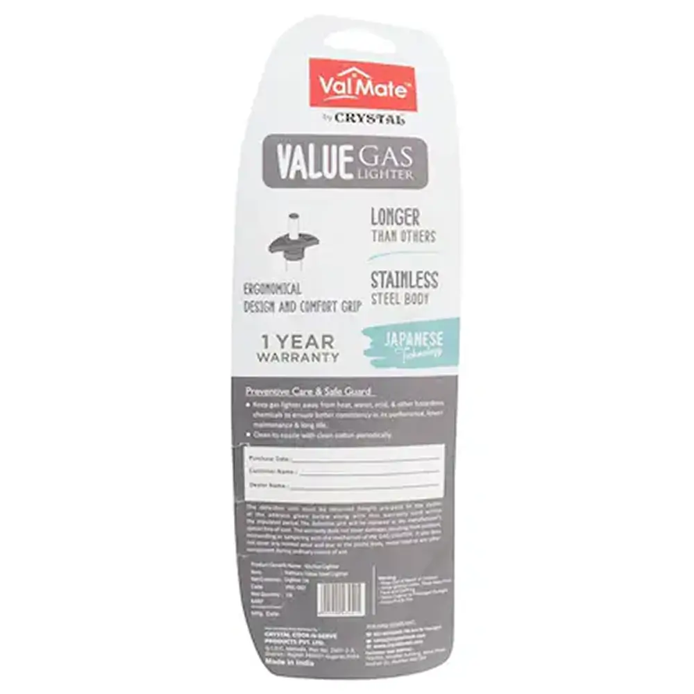 Elevate your gas stove experience with the Crystal Valmate Value Steel Gas Lighter. Designed for optimal performance, this compact lighter ensures a reliable ignition every time. Its robust steel construction withstands daily use and harsh environments, ensuring durability and long lifespan. The Crystal Valmate’s ergonomic design fits comfortably in hand, making it easy to maneuver and control.