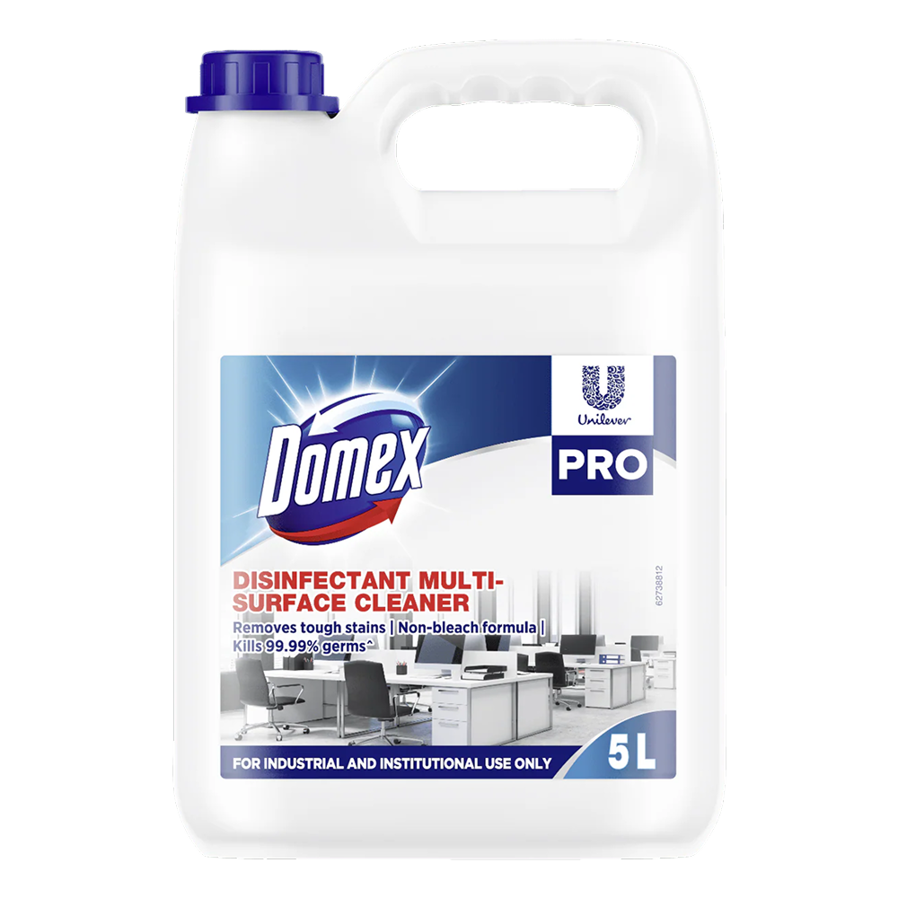 Domex Disinfectant Multi-Surface Cleaner Kills 99.99% Germs. It helps in keeping your surfaces clean and disinfected. This multi-surface cleaner is suitable for daily use on different types of surfaces. Get Domex Disinfectant Multi-Surface Cleaner 5L to ensure the meeting hygiene standards of your office, factory and other similar business areas.