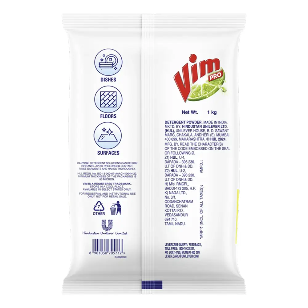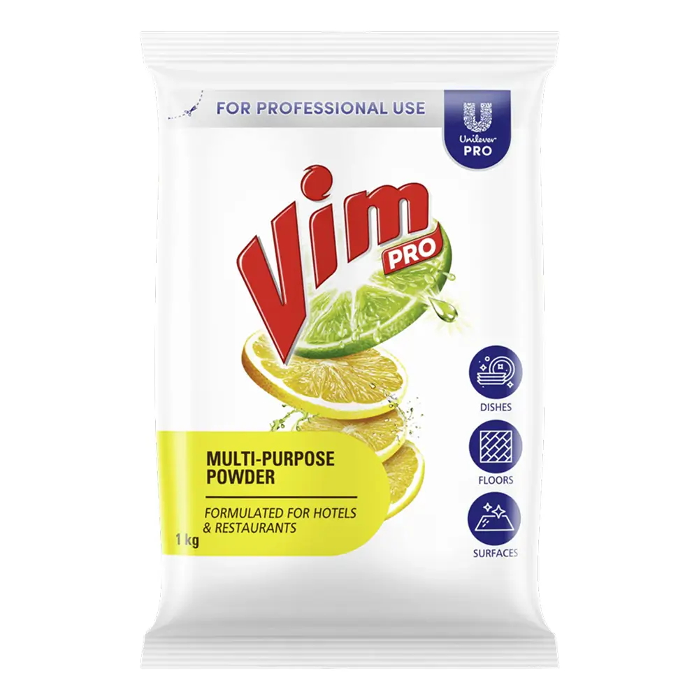 Vim Pro Multipurpose Powder is specially formulated for use in commercial kitchens in hotels, restaurants and cafes. With high foam and AD formula this powder is capable of cleaning floors, surfaces, and dishes with one product. Vim multipurpose powder with its specialized formulation helps break down grime and grease from cooking oils leaving your kitchen with spotless surfaces, ensuring the best hygiene for your customers.